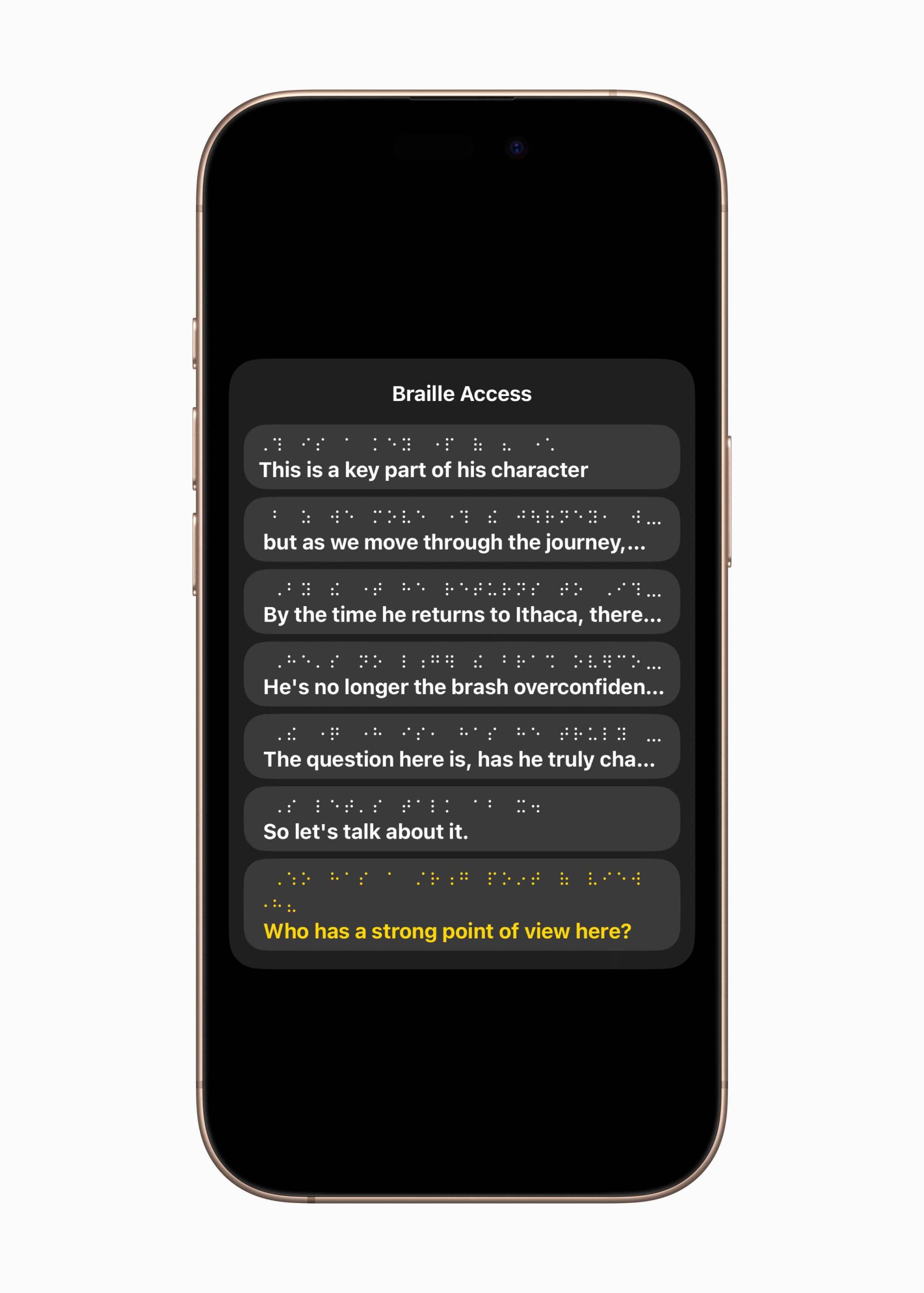 「Braille Access」は、iPhone、iPad、Mac、Apple Vision Proを点字ノートツールとして利用できる全く新しい機能です。内蔵アプリランチャーを使用して、点字ディスプレイまたは外部接続された点字デバイスからアプリを簡単に起動できます。